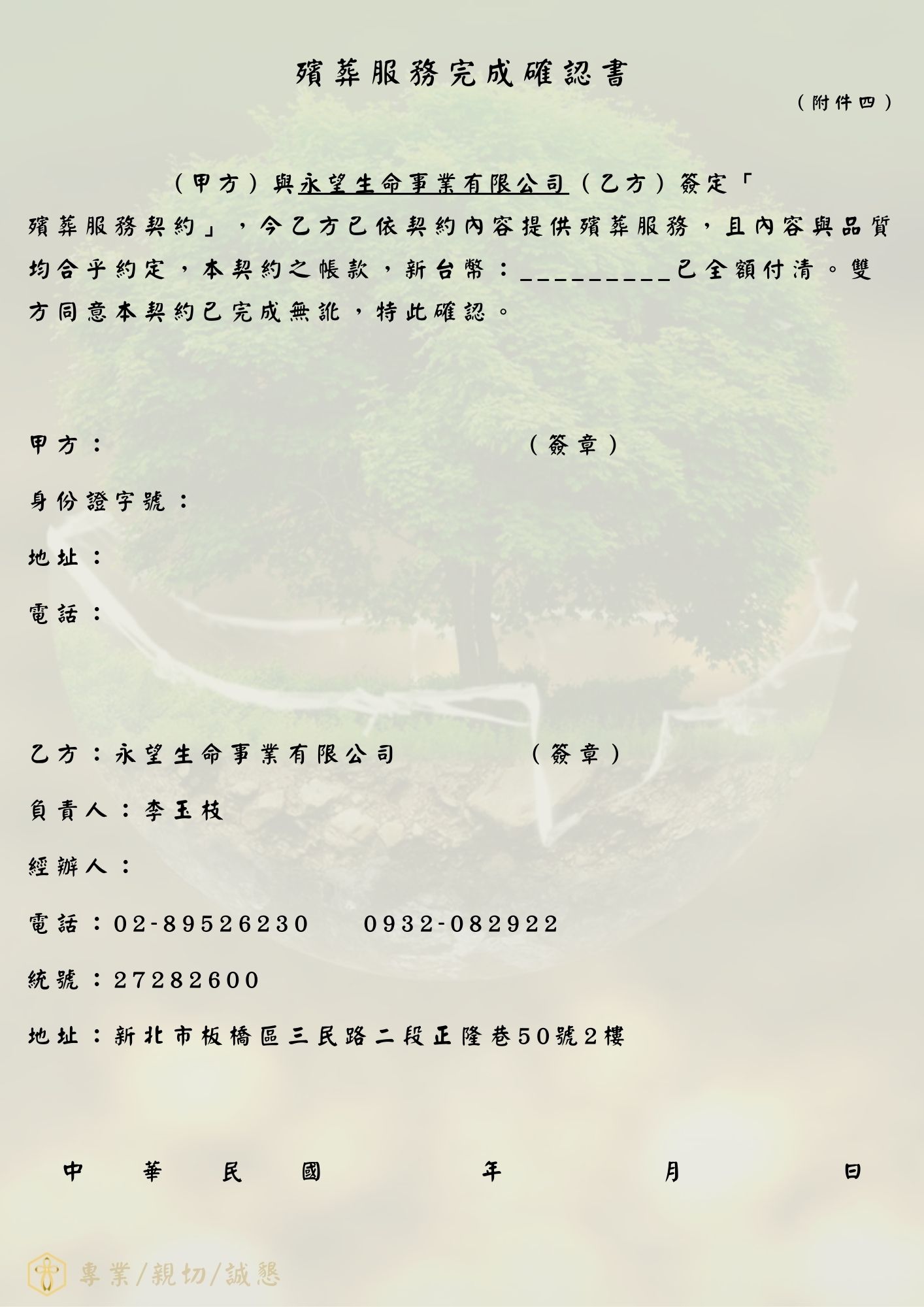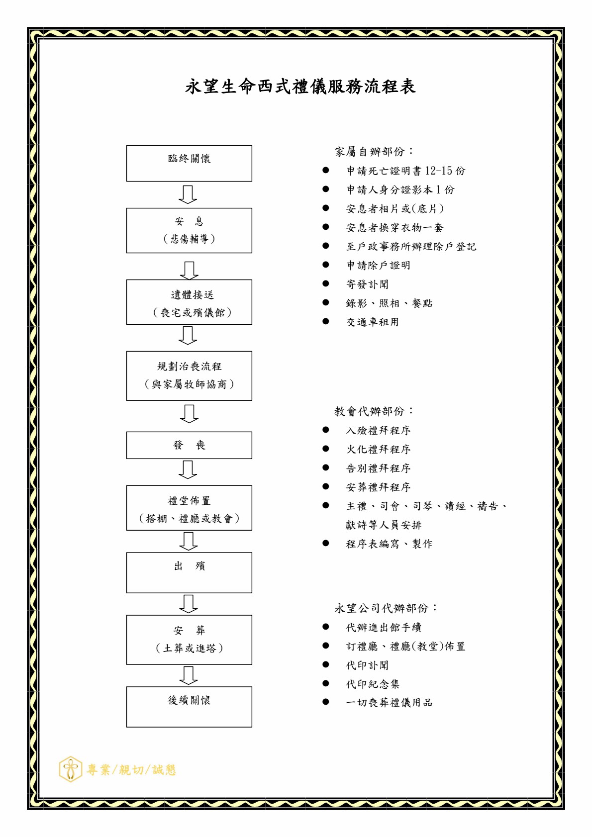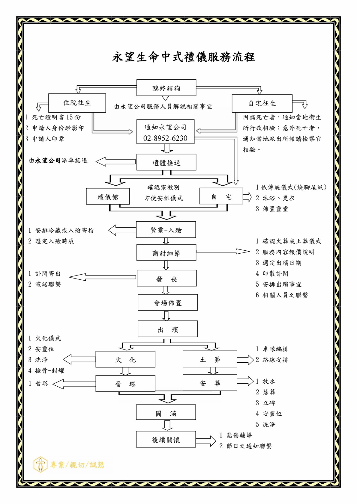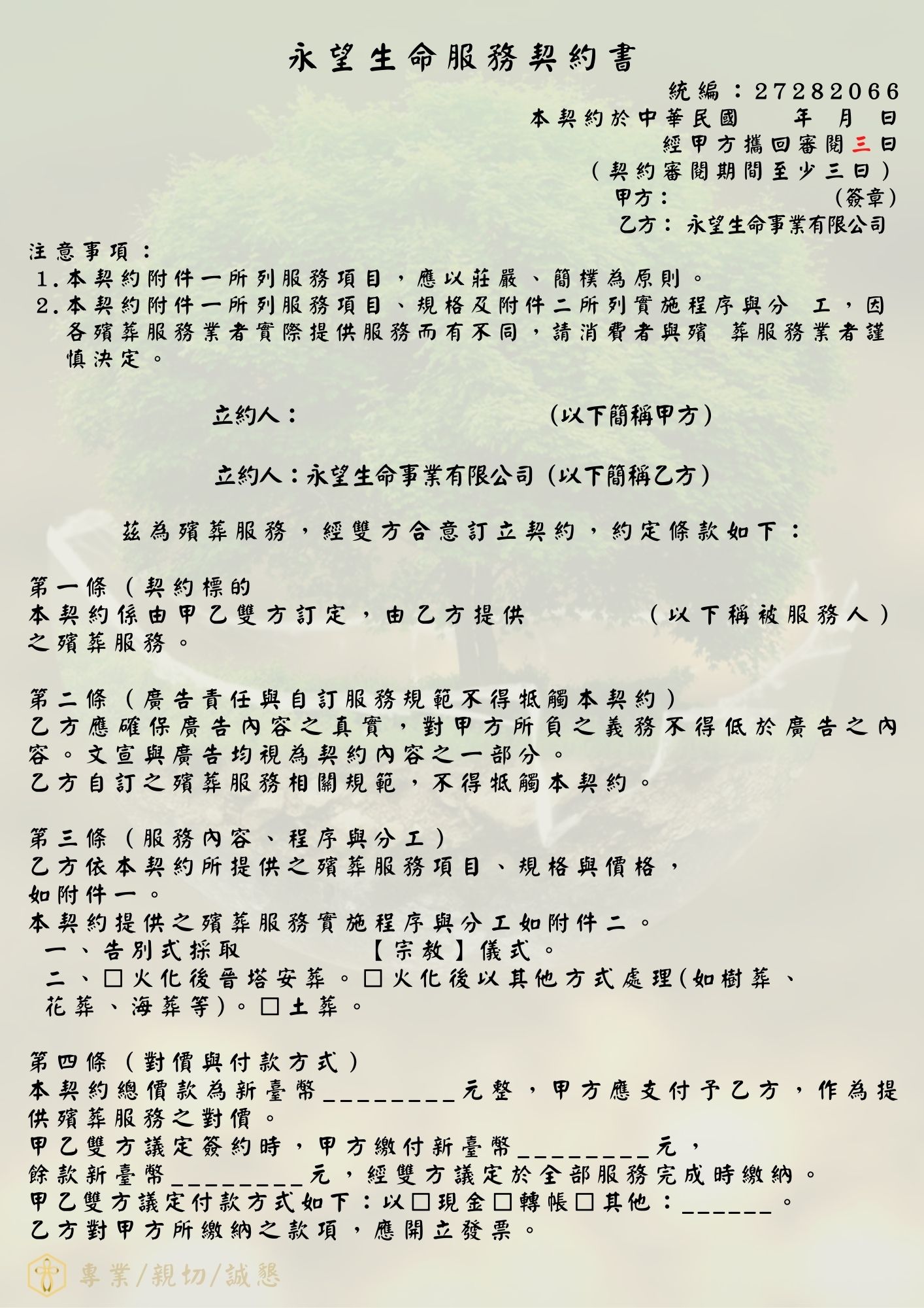 永望生命秉持著公平公開原則,依所需信仰及喜好自選服務項目,不必拘束於傳統或一般禮儀公司制式契約,永望生命不斷研究及創新每個客戶的需求,以不斷滿足客戶所須並忠於客戶所託。